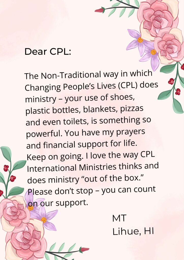 The Non-Traditional way in which Changing People’s Lives (CPL) does ministry – your use of shoes, plastic bottles, blankets, pizzas and even toilets, is something so powerful. You have my prayers and financial support for life. Please don’t stop – you can count on our support.