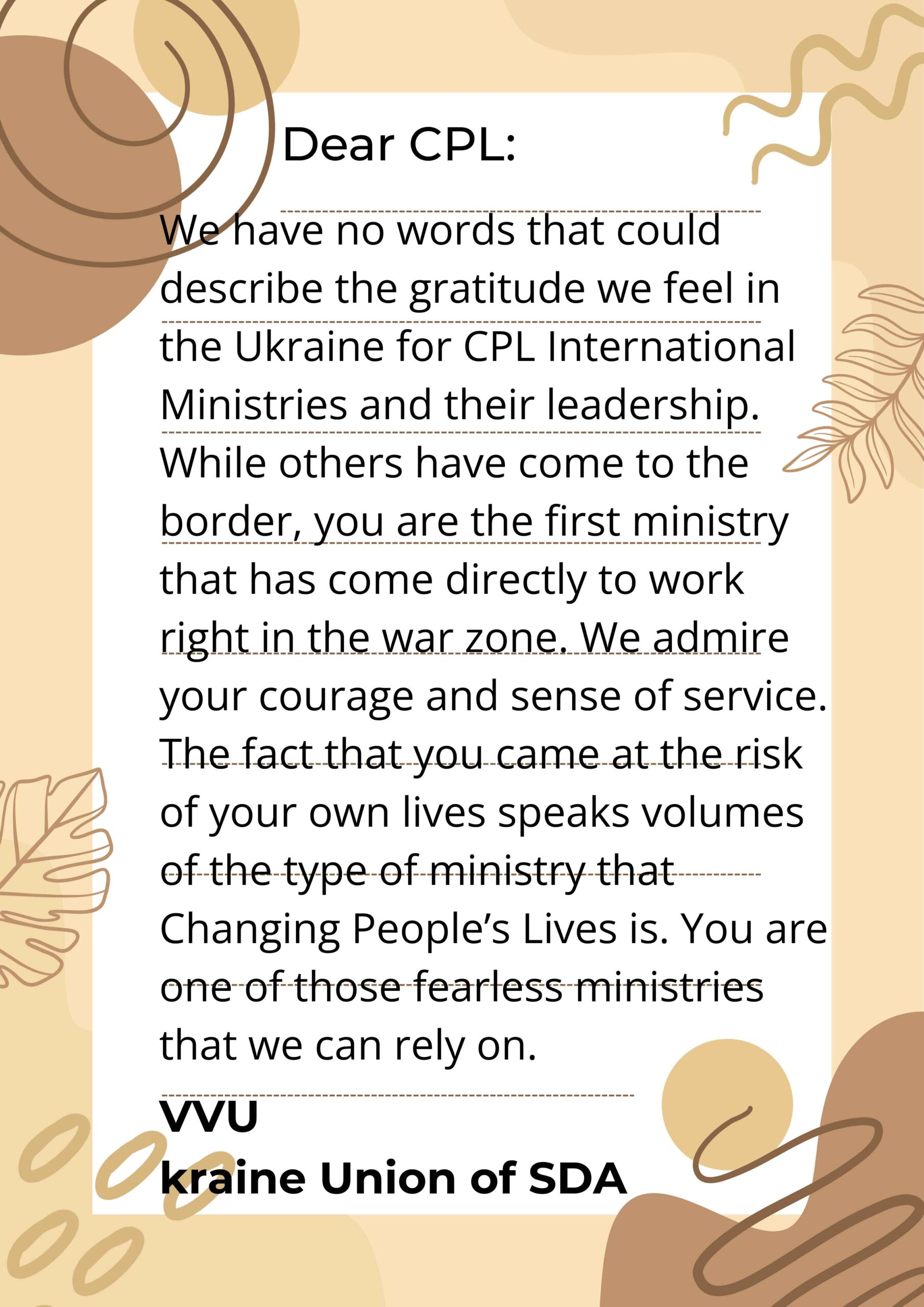 We have no words that could describe the gratitude we feel in the Ukraine for CPL International Ministries and their leadership. While others have come to the border, you are the first ministry that has come directly to work right in the war zone. We admire your courage and sense of service. The fact that you came at the risk of your own lives speaks volumes of the type of ministry that Changing People’s Lives is. You are one of those fearless ministries that we can rely on.