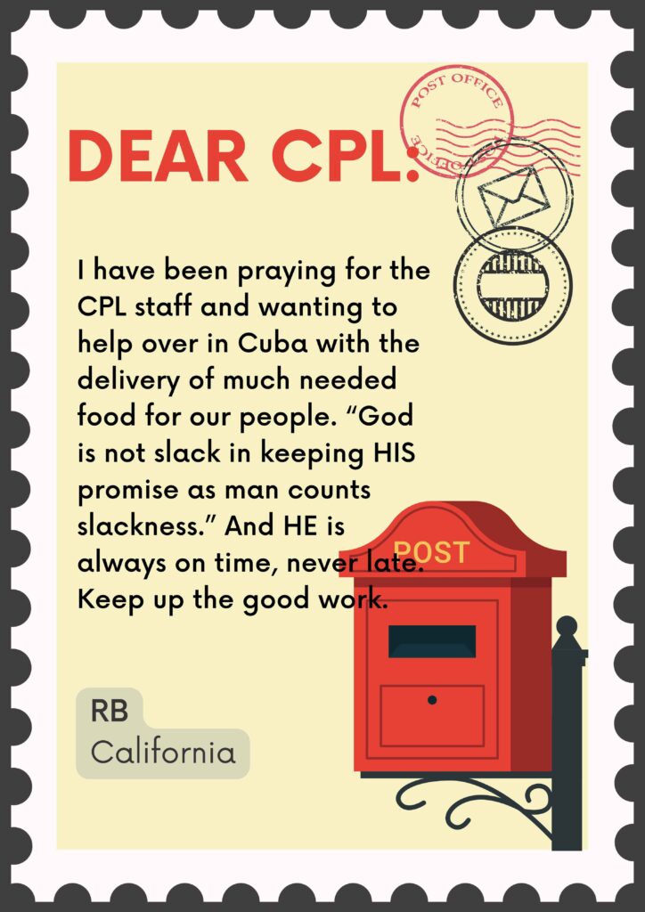 I have been praying for the CPL staff and wanting to help over in Cuba with the delivery of much needed food for our people. “God is not slack in keeping HIS promise as man counts slackness.” And HE is always on time, never late. Keep up the good work.