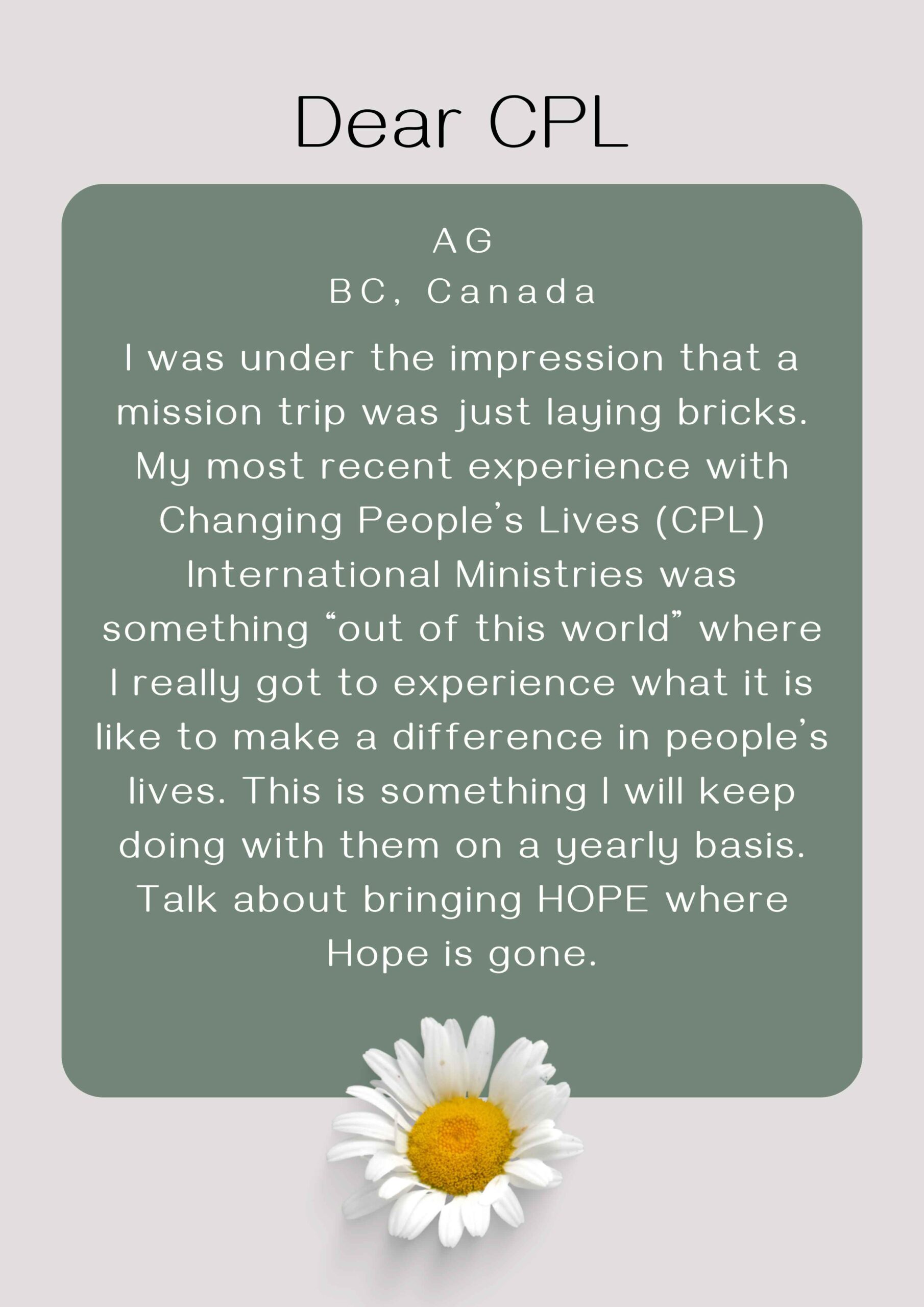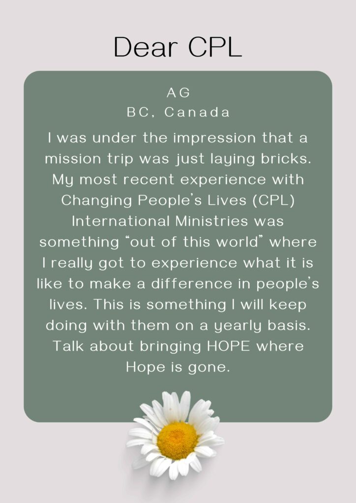 I was under the impression that a mission trip was just laying bricks. My most recent experience with Changing People’s Lives (CPL) International Ministries was something “out of this world” where I really got to experience what it is like to make a difference in people’s lives. This is something I will keep doing with them on a yearly basis. Talk about bringing HOPE where Hope is gone.