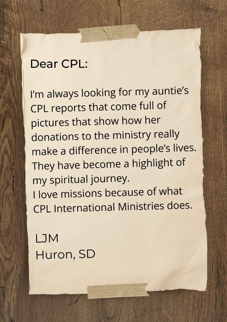 I’m always looking for my auntie’s CPL reports that come full of pictures that show how her donations to the ministry really make a difference in people’s lives. They have become a highlight of my spiritual journey. I love missions because of what CPL International Ministries does.