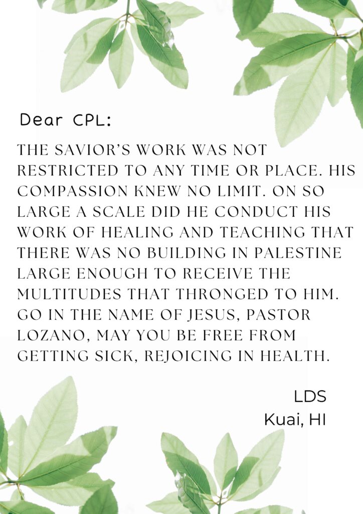 The Savior’s work was not restricted to any time or place. His compassion knew no limit. On so large a scale did HE conduct HIS work of healing and teaching that there was no building in Palestine large enough to receive the multitudes that thronged to HIM. Go in the name of Jesus, Pastor Lozano, may you be free from getting sick, rejoicing in health.
