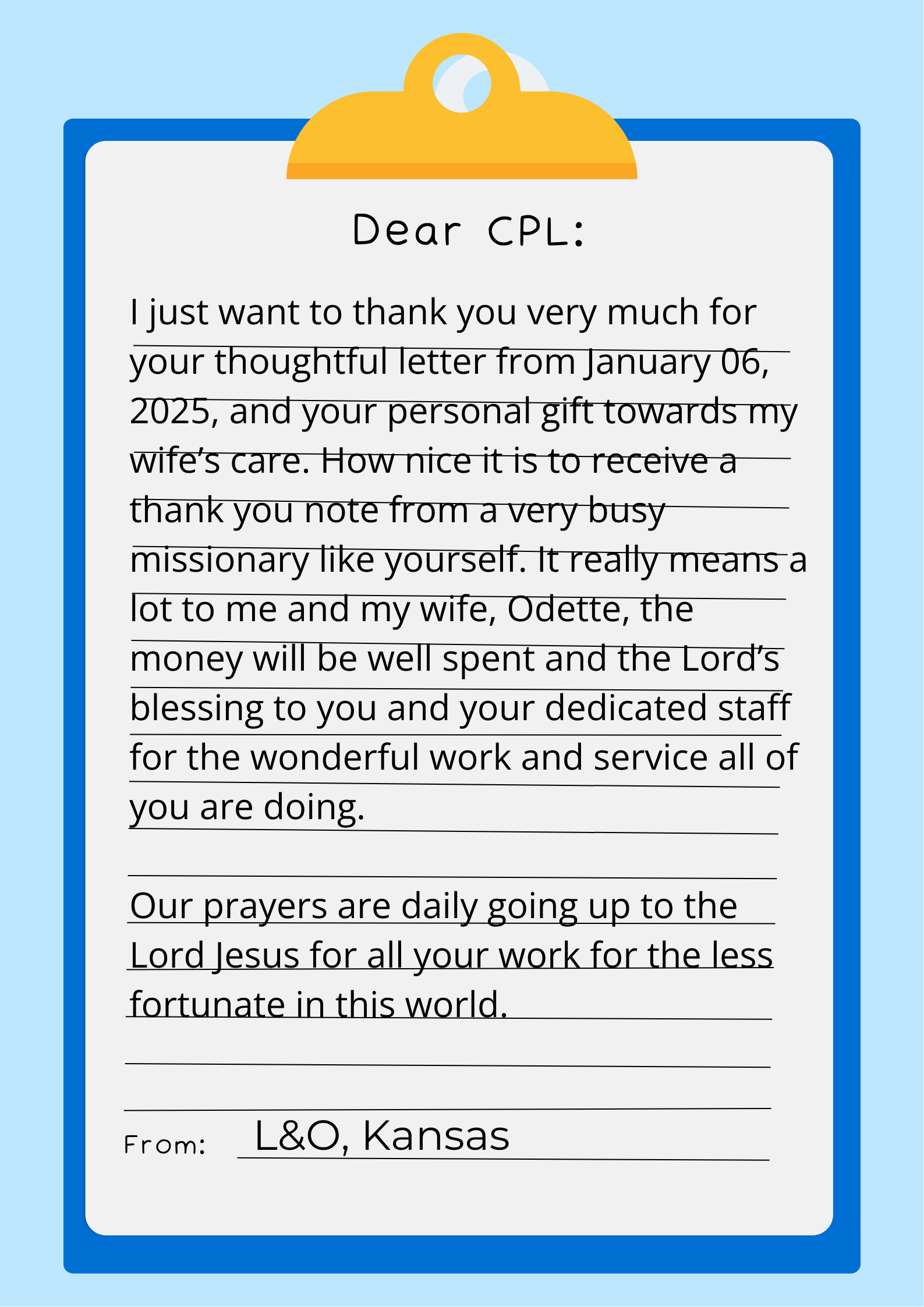 I just want to thank you very much for your thoughtful letter and your personal gift towards my wife’s care. How nice it is to receive a thank you note from a very busy missionary like yourself. It really means a lot to me and my wife, Odette.
