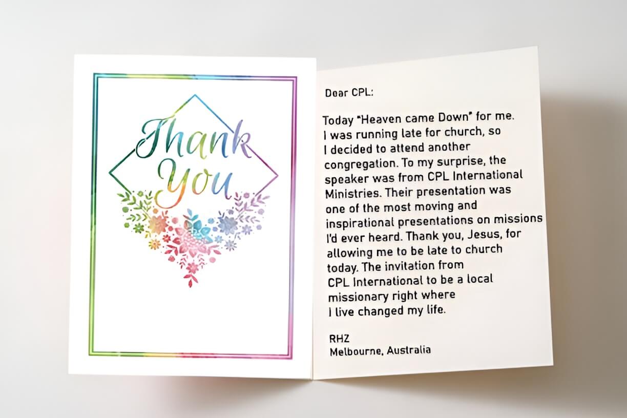 Today “Heaven came Down” for me. I was running late for church, so I decided to attend another congregation. To my surprise, the speaker was from CPL International Ministries. Their presentation was one of the most moving and inspirational presentations on missions I’d ever heard. Thank you, Jesus, for allowing me to be late to church today. The invitation from CPL International to be a local missionary right where I live changed my life.
