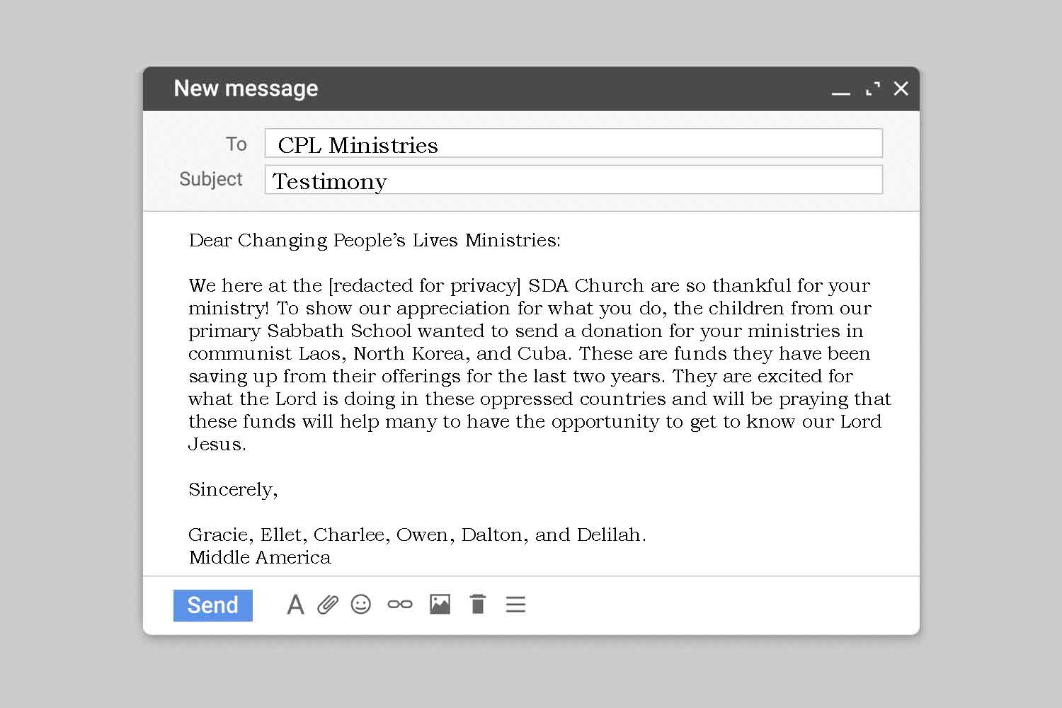 Dear Changing People’s Lives Ministries: We here at the [redacted for privacy] SDA Church are so thankful for your ministry! To show our appreciation for what you do, the children from our primary Sabbath School wanted to send a donation for your ministries in communist Laos, North Korea, and Cuba. These are funds they have been saving up from their offerings for the last two years. They are excited for what the Lord is doing in these oppressed countries and will be praying that these funds will help many to have the opportunity to get to know our Lord Jesus.